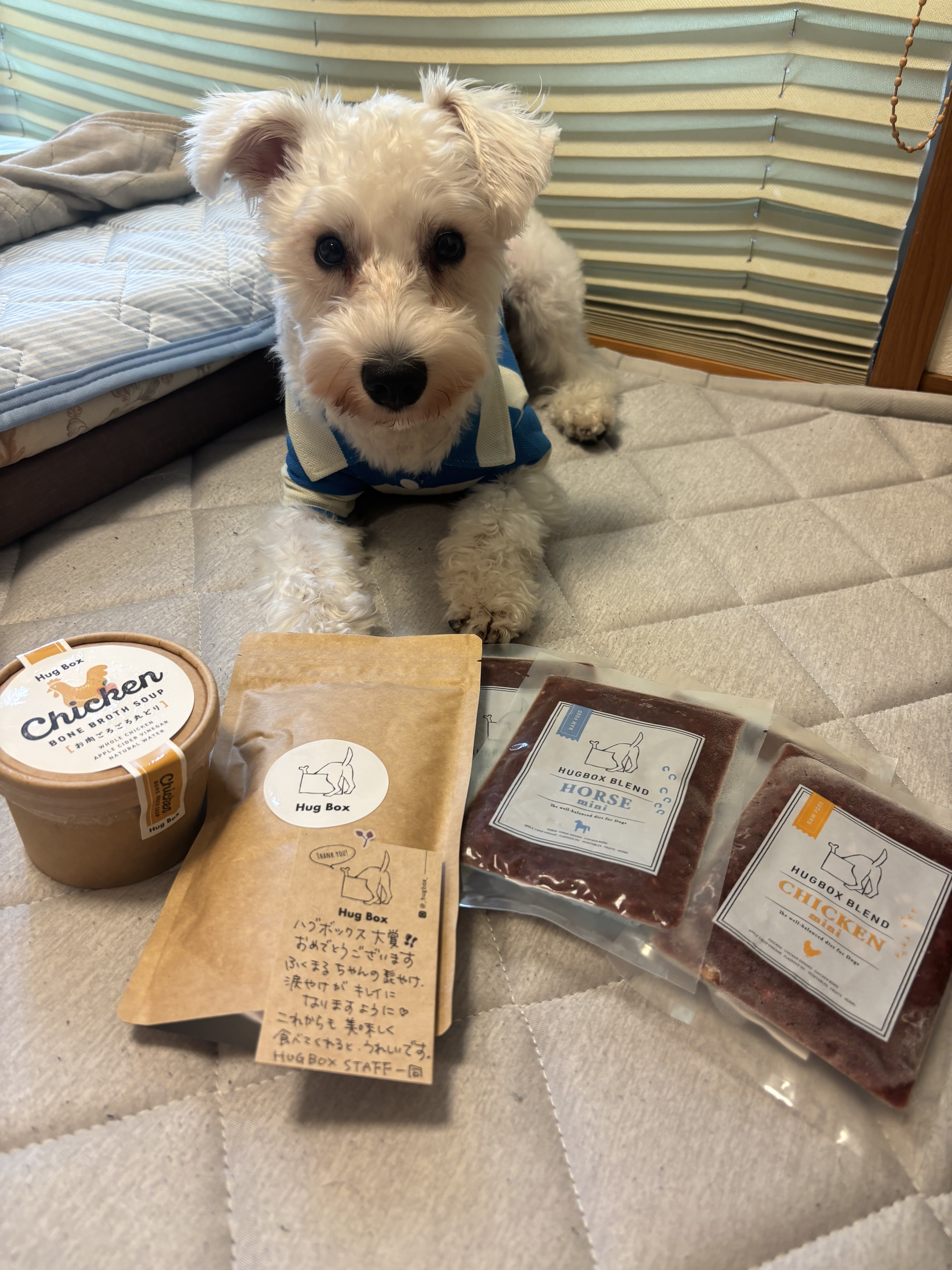 トップ > うちの子 活動報告 > ハグボックス大賞、受賞👏 ふくまる 2025/10/03 23:58 ハグボックス大賞、受賞👏 1ヶ月経過の前に少し余談です🍵 実はふくまる、8月のハグボックス大賞に選んで頂きました🎁 ありがとうございます☺️ プレゼントは チキン100g×2 ホース100g×2 丸鶏ボーンブロススープ🐔 ホースジャーキー を頂きました👏 嬉しいメッセージと美味しいお肉が増えて、 飼い主も、ふくまるも感謝の気持ちでいっぱいです🥰 今月にハグっと通信に載るのかな? もし載ってましたら、 あー、白シュナの子だー!と思ってくれたら嬉しいです✨ 次回こそは1ヶ月経過をまとめます✏️ いいね 共有する 共有する X facebook LINE リンクをコピー コメントする 1 件の返信 (新着順) ミュートしたユーザーの投稿です。 投稿を表示 モナ 2025/10/04 21:21 ふくまるくん♡ ハグボックス大賞おめでとうございます㊗️🎉🎉 プレゼントたくさんもらえて嬉しいですね☺️🎁 これからもハグボックスモリモリ食べて元気いっぱい過ごしてくださいね✨✨✨ いいね 返信する