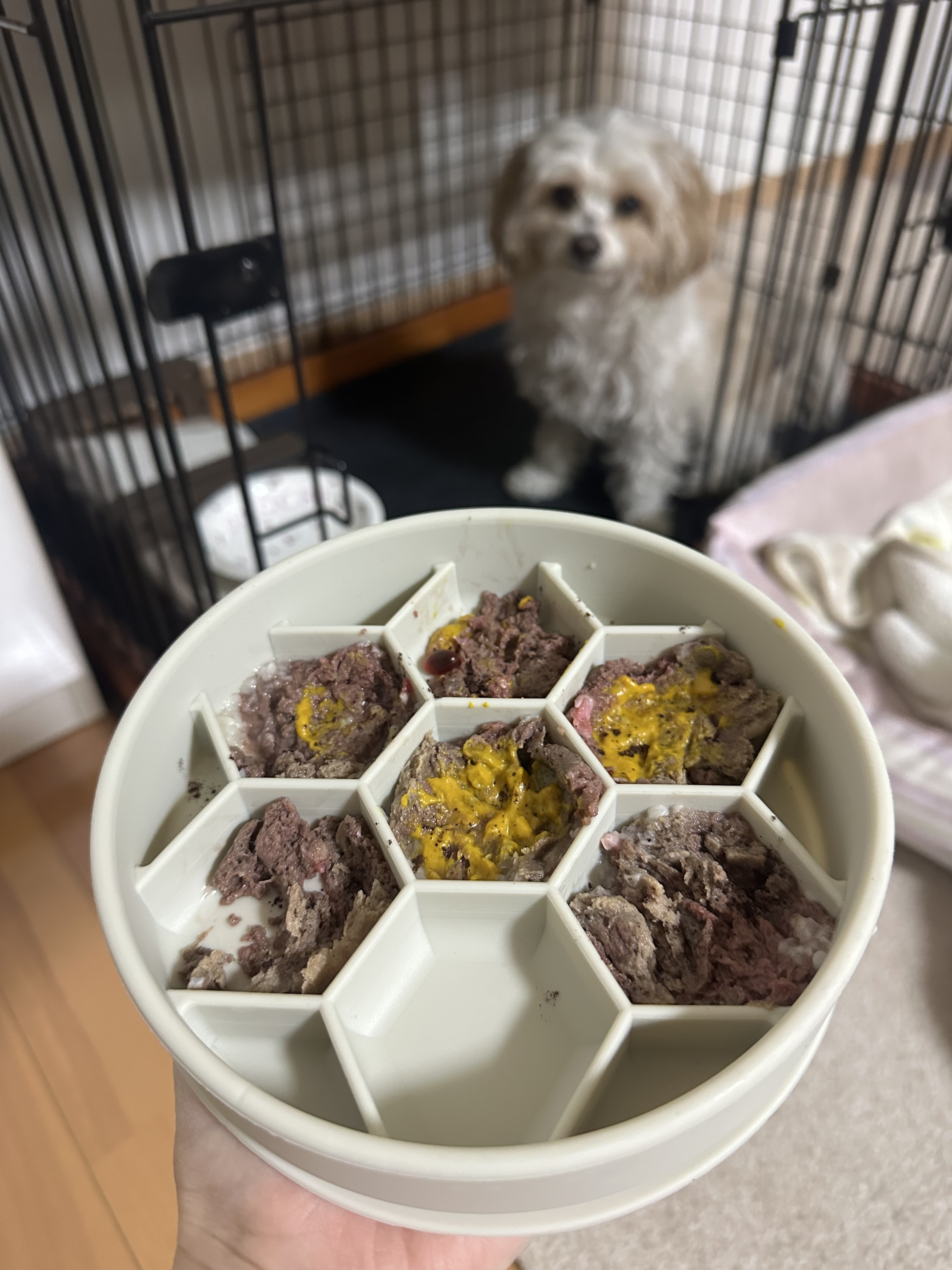 投稿を表示うちのホイップも早食いなので、平たく器に伸ばして伸ばしてあげてます😅