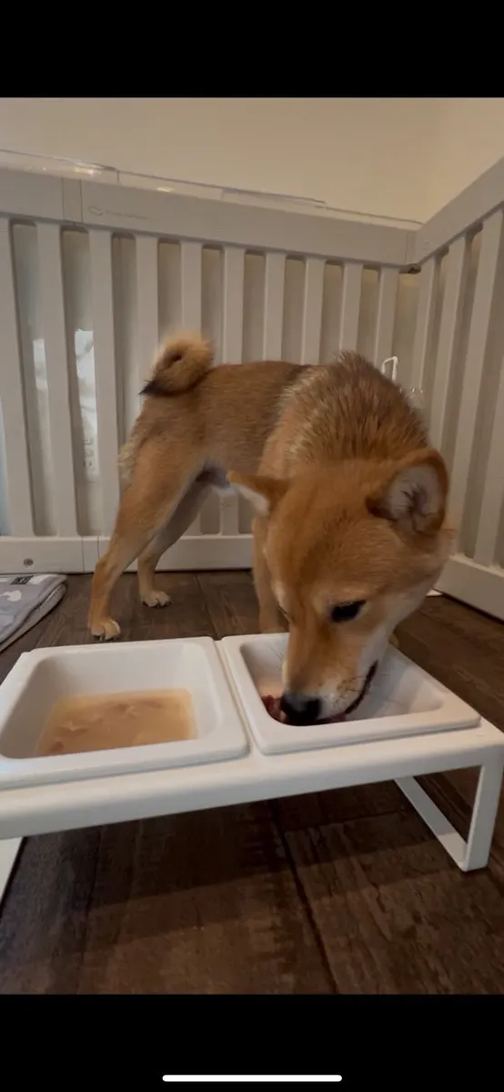 体が曲がってることに気付かないまま、hug boxブレンドにがっついます🐶