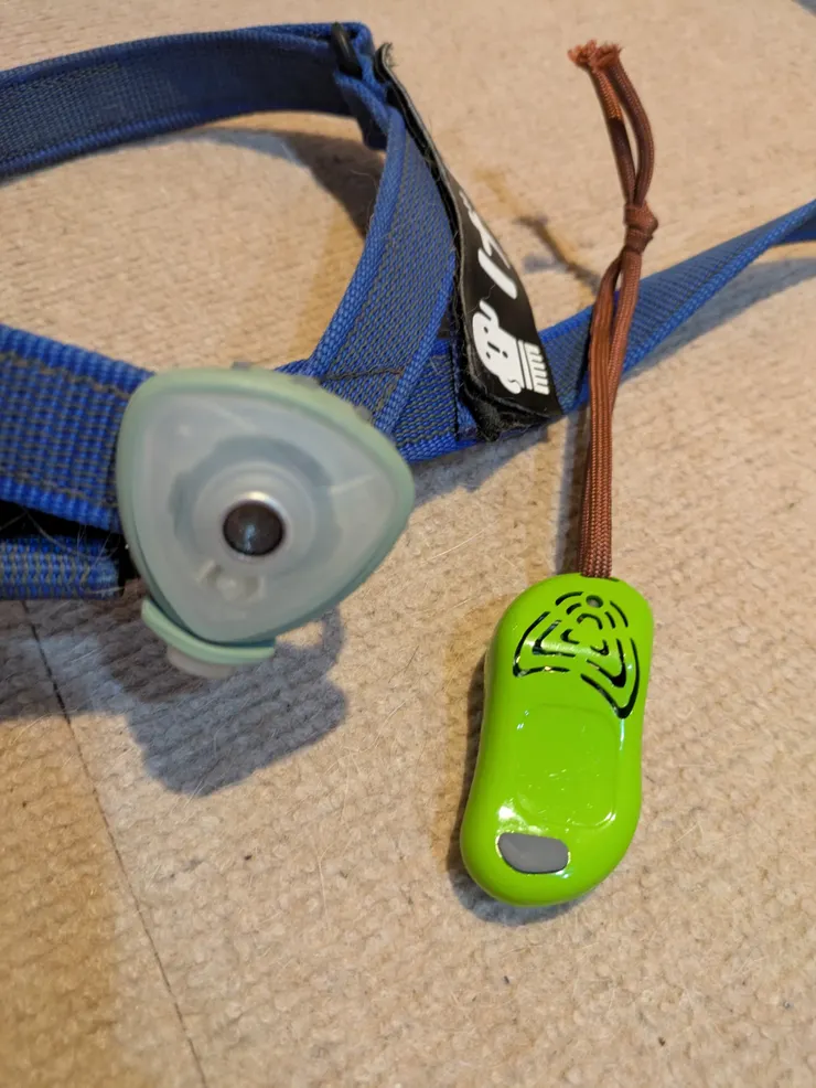 チックレスは散歩バッグに、サウンドシールドはハーネスにつけています。