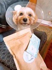 アンディ6歳になりました‼︎HUGBOXさんから、お誕生日のプレゼント🎁が届きました!HUGBOXを食べ始めて約2年、病気もせずに健康に過ごせています…が、今年はエリザベスカラーでの誕生日となってしまいました😓数日前から前脚を舐めこわし、皮膚炎になってしまいました💦誕生日までに治るようにと、すぐに病
