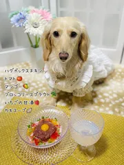 リルちゃん 4歳のお誕生日おめでとう🎉 彩りとお腹に優しい素敵なディナー💝 メインディッシュの ハグボックスの生食❣️は みんな虜よね〜 これからも、wan生を楽もうね♪( ´▽`)